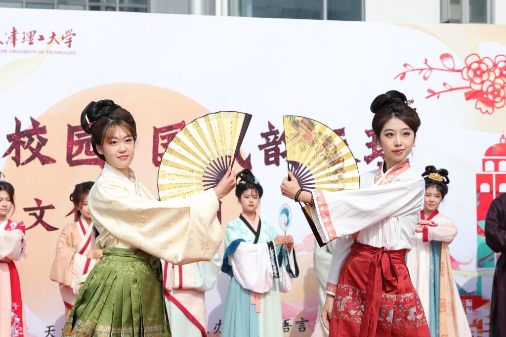 活动在一场美轮美奂的汉服走秀中拉开帷幕,同学们身着各式汉服,伴着悠扬的琴声走来,步伐轻盈、衣袂飘飘,观众沉浸在跨越时空的文化共鸣之中;哥伦比亚和秘鲁同学的民族舞蹈以明媚的色彩和轻快的节奏将大家带入热情的拉美大陆;中国学生的传统舞蹈《醉春风》则将折扇技法与中国古典舞的神韵相结合,充满灵动与生命活力。