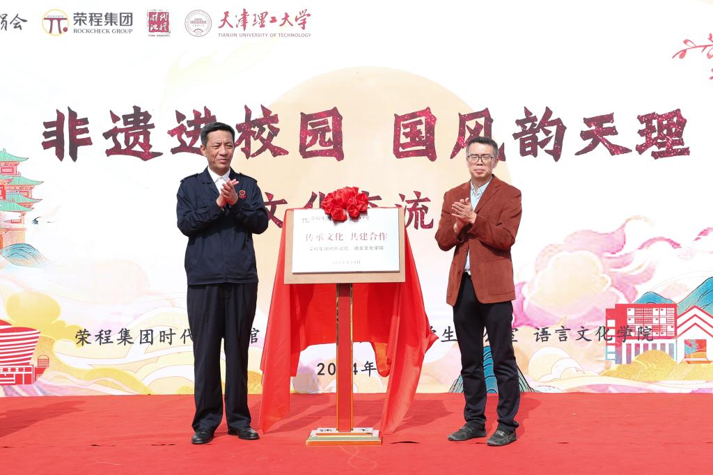 张洪涛和王铁分别致辞。张洪涛指出,非物质文化遗产是中华民族智慧与文明的结晶,是中华文化的瑰宝。本次非物质文化遗产进校园活动是校企联手让非遗文化在校园生根发芽的有力举措,也期待青年学子坚定文化自信,涌现出更多优秀的非物质文化遗产传承人。王铁强调,希望借助由校外非遗艺术家和校内中外师生携手打造的文化交流平台,不断增强在校师生对中华优秀传统文化的了解,帮助大家感知中国、读懂中国。随后,双方领导为荣程集团时代记忆馆和我校语言文化学院的共建项目进行揭牌。