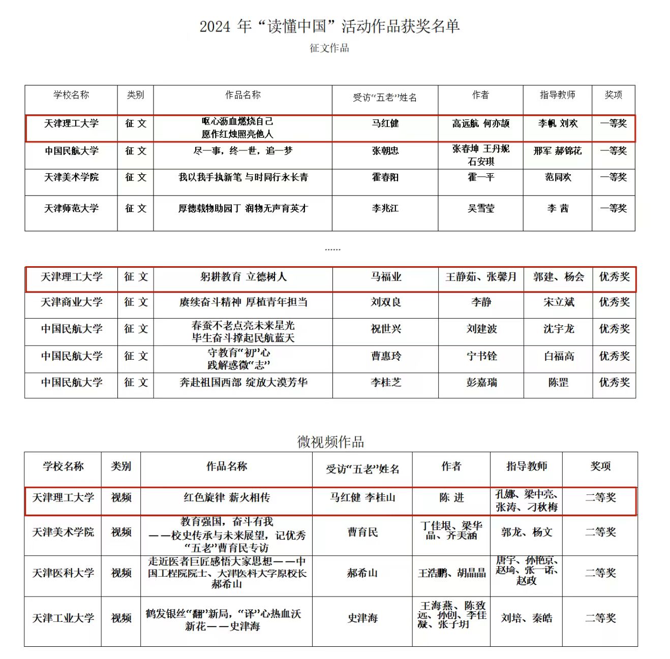 近日,市教育系统关心下一代工作委员会《关于公布2024年“读懂中国”活动评审结果的通知》(津教关〔2024〕16号)公布,我校关工委选送的2篇征文、1个微视频荣获佳绩。其中,材料科学与工程学院关工委选送的《呕心沥血燃烧自己 愿作红烛照亮他人》获得征文类一等奖,语言文化学院关工委选送的《躬耕教育 立德树人》获得征文类优秀奖,校关工委选送的《红色旋律 薪火相传》获得视频类二等奖。
