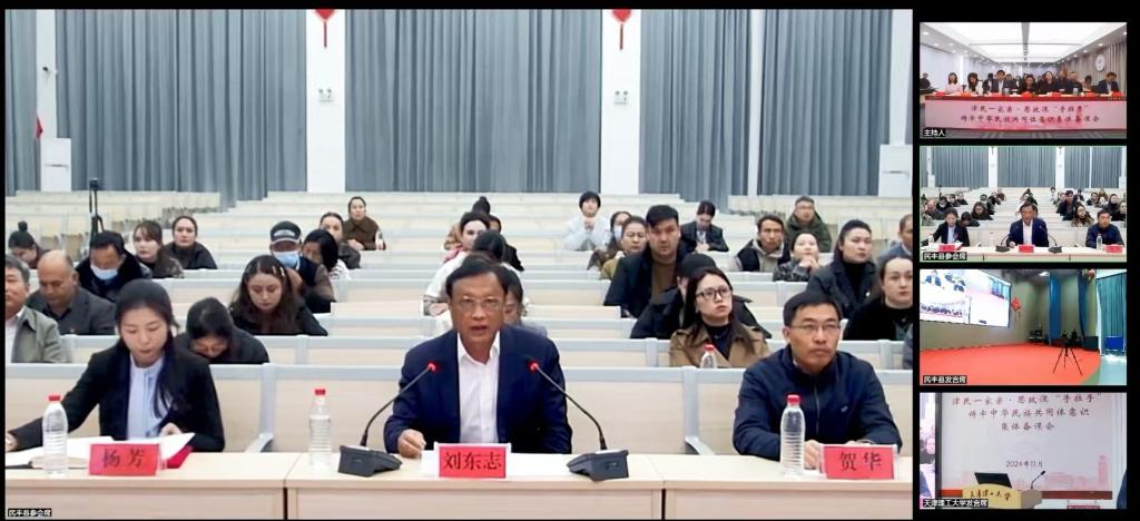 为引导思政教师将铸牢中华民族共同体意识融入教学过程,11月7日,学校与新疆和田地区民丰县教科局通过云端连线的方式,共同举办“津民一家亲·思政课‘手拉手’—— 铸牢中华民族共同体意识集体备课会”。校党委书记刘东志,市社会主义学院教研部主任、教授吴星辰,西青区委统战部副部长邰菲,天津援疆前指人才部副部长、和田地区教育局副局长贺华,民丰县教科局党组书记杨芳出席,两地师生代表参加活动。校党委副书记许瑞主持活动。