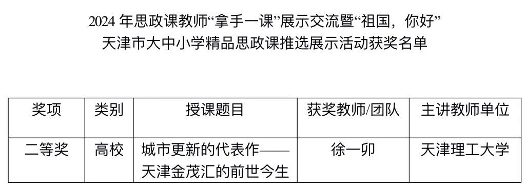 近日,市委宣传部、市教育两委公布了2024年思政课教师“拿手一课”展示交流暨“祖国,你好”天津市大中小学精品思政课推选展示活动获奖结果,我校马克思主义学院教师徐一卯荣获二等奖。