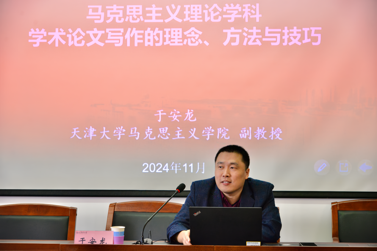 天津大学马克思主义学院副教授于安龙作题为“马克思主义理论学科学术论文写作中的理念、方法与技巧”的专题报告会。于安龙将写作理念概括为“顶天立地”“入流特立”和“知行合一”等内容,并进行了全面解读。他分别介绍了论文准备期、写作期的写作技巧。他强调,创新性是论文的灵魂,并从选题、框架、论证等方面分享了论文的写作感悟。