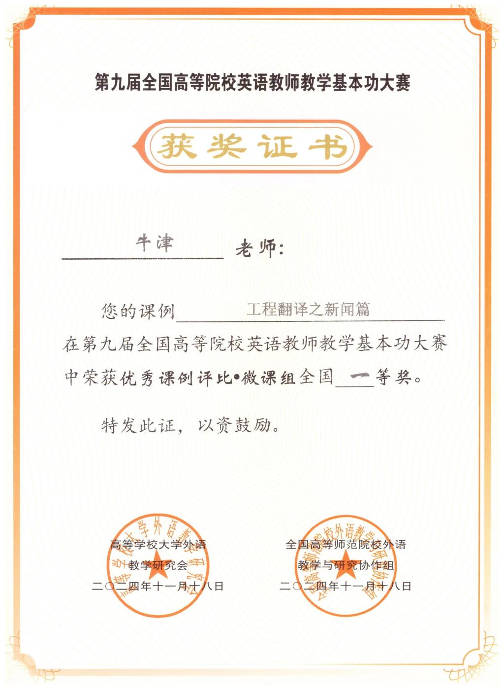 2024年全国高等院校英语教学学术年会暨第九届全国高等院校英语教师教学基本功大赛在湖北省武汉市举办。我校语言文化学院英语系教师牛津荣获优秀课例评比•微课组全国一等奖,蒲海丰荣获优秀指导教师奖。