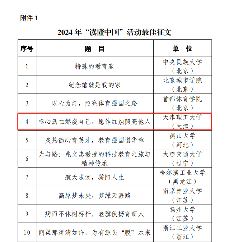 近日,教育部关工委公布了2024年“读懂中国”活动入选作品的名单。我校报送的《呕心沥血燃烧自己,愿作红烛照亮他人》荣获最佳征文,学校被评为表扬单位。