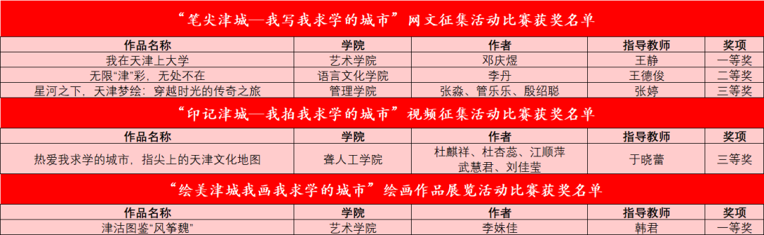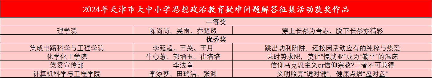 近日,市教育两委公布了思想政治类系列比赛评审结果,我校师生在“2024年天津市大中小学‘我和我求学的城市’主题教育系列活动”“2024年天津市大中小学思想政治教育疑难问题解答征集活动”等多项比赛中斩获佳绩。