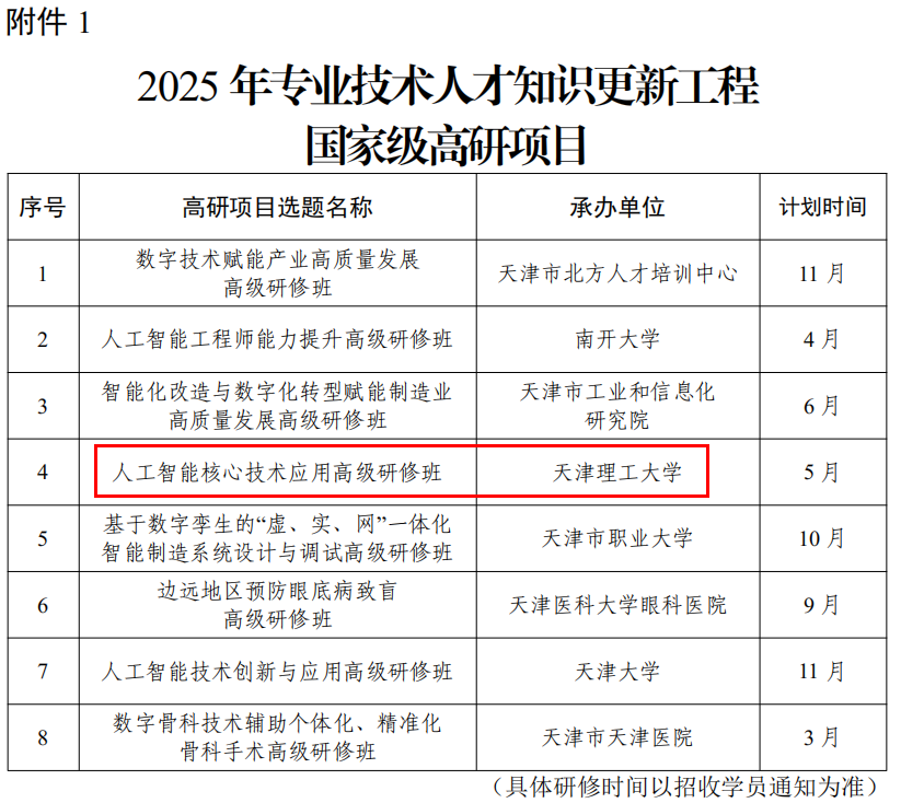 近日,天津市人社局发布《市人社局关于公布2025年专业技术人才知识更新工程高级研修项目计划的通知》(津人社办函〔2025〕131号),我校申报的“人工智能核心技术应用高级研修班”(国家级高研项目)和“人工智能与大数据技术应用能力提升高级研修班”(市级高研项目)均获批立项。