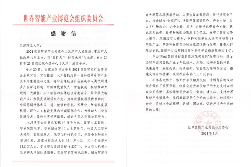 近日,学校收到世界智能产业博览会组委会的感谢信,信中对我校在博览会举办过程中所给予的支持表示感谢。