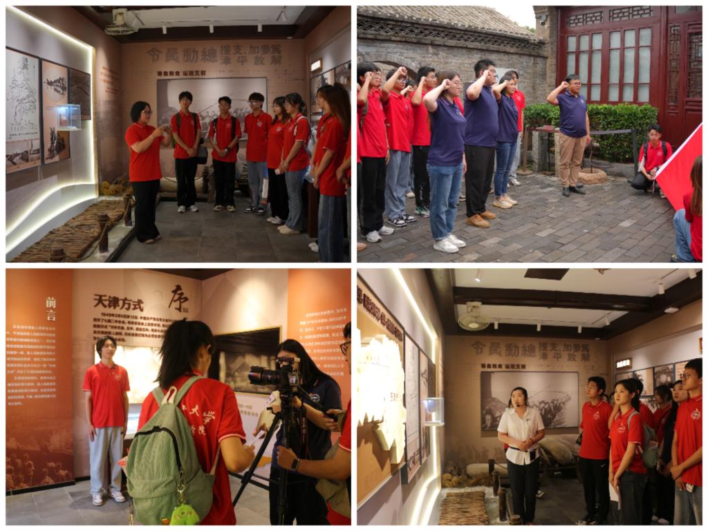 在平津战役天津前线指挥部旧址,实践团通过参观学习、沉浸体验、主题宣讲等方式传承红色基因,赓续红色血脉。大家跟随讲解员的脚步,回顾革命先烈艰苦卓绝、英勇奋斗的历程;在小院内,师生重温入团誓词,进一步坚定理想信念;录制“平津战火荣光,青春使命担当”“寻迹红色遗址,感悟百年初心”主题微课;开展“团旗下的演讲”,沉浸式自讲、自学、自悟,与革命先烈跨时空“对话”。