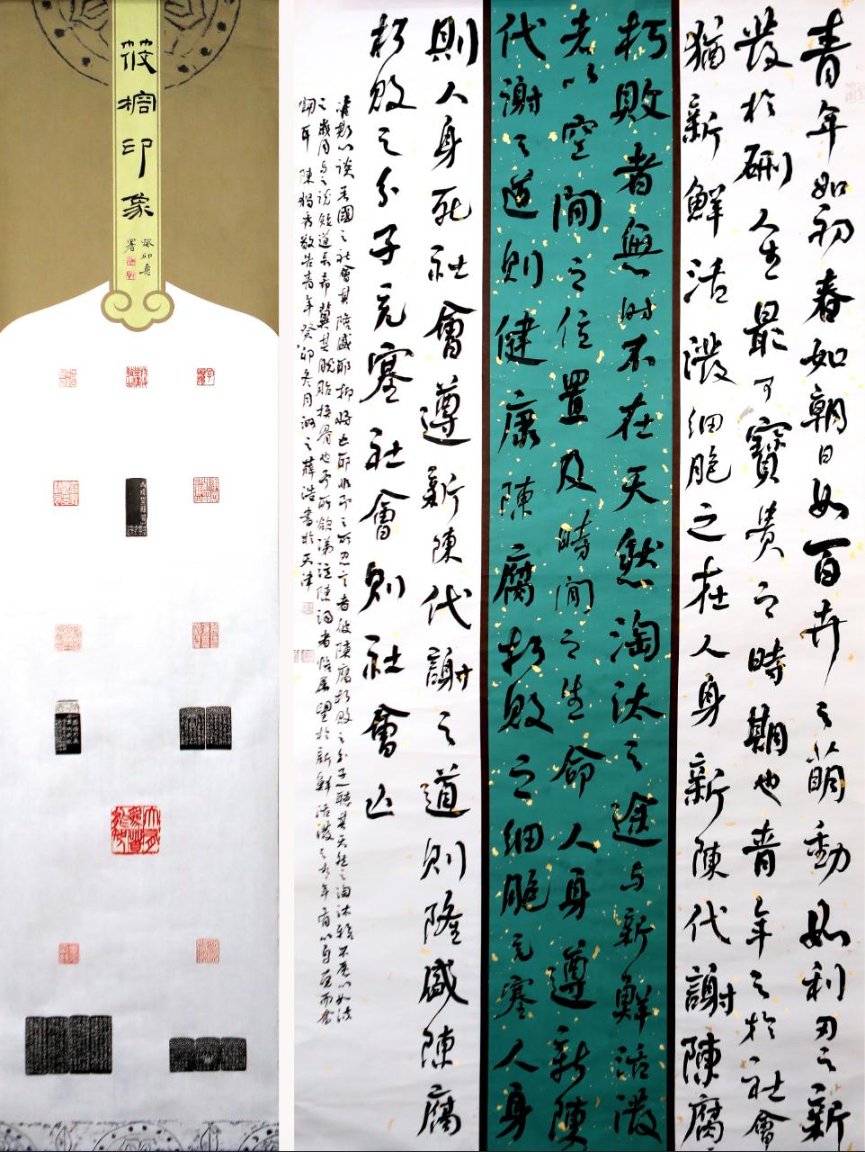 书法作品《行书陈独秀敬告青年》内容是五四新文化运动领袖陈独秀先生为《新青年》撰写的一段发刊词。书法作品以清人何绍基行书为法,用笔沉厚顿挫,又不乏灵转飞动;章法采用纵向三段式,中间深绿、两侧淡兰、以棕色局条拼接;这些都与振聋发聩而又充满青春意气的文字内容相得益彰。