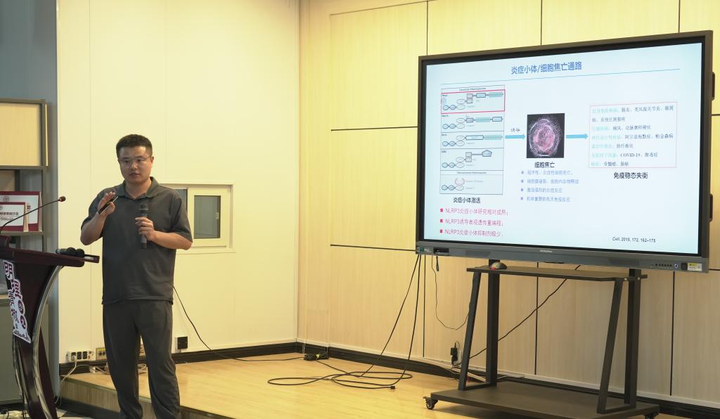 杨忠金以“NLRP3炎症小体抑制剂的发现与机制研究”为题,介绍了炎症小体/细胞焦亡与疾病的关系以及NLRP3炎症小体通路等内容。该研究通过建立NLRP3激活步的细胞筛选模型,发现了双硫仑抑制NLRP3通路的“老药新用”机制,高效的青蒿素衍生物NIC-136能够通过ROS抑制NLRP3通路,nM活性水平的硼酸类化合物NIC-102能够通过促进NLRP3泛素化来阻碍炎症小体组装。