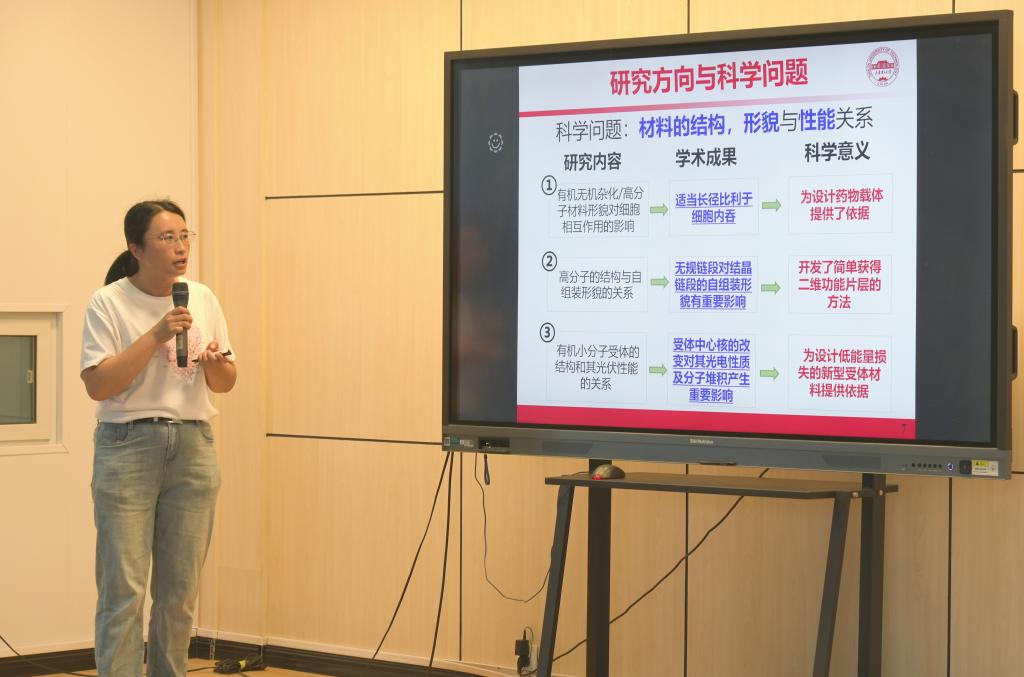 王晶以“有机无机杂化与高分子材料在生物医药和光伏领域中的应用研究”为题,聚焦“材料的结构、形貌与性能关系”核心科学问题,介绍了有机无机杂化/高分子材料形貌对细胞相互作用的影响、高分子的结构与自组装形貌的关系、有机小分子受体的结构和光伏性能的关系等研究内容,并为药物载体设计奠定了理论基础,也为设计低能量损失的新型受体材料提供了依据。