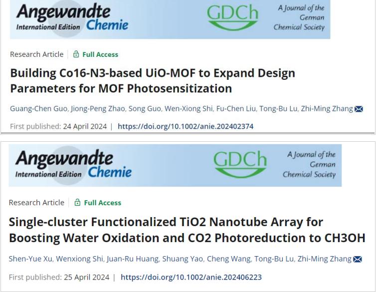 近日,我校新能源材料与低碳技术研究院张志明与鲁统部教授团队在Angew. Chem.期刊上发表两篇最新研究成果,分别是“Building Co16-N3-based UiO-MOF to Expand Design Parameters for MOF Photosensitization”和“Single-cluster Functionalized TiO2Nanotube Array for Boosting Water Oxidation and CO2Photoreduction to CH3OH”。