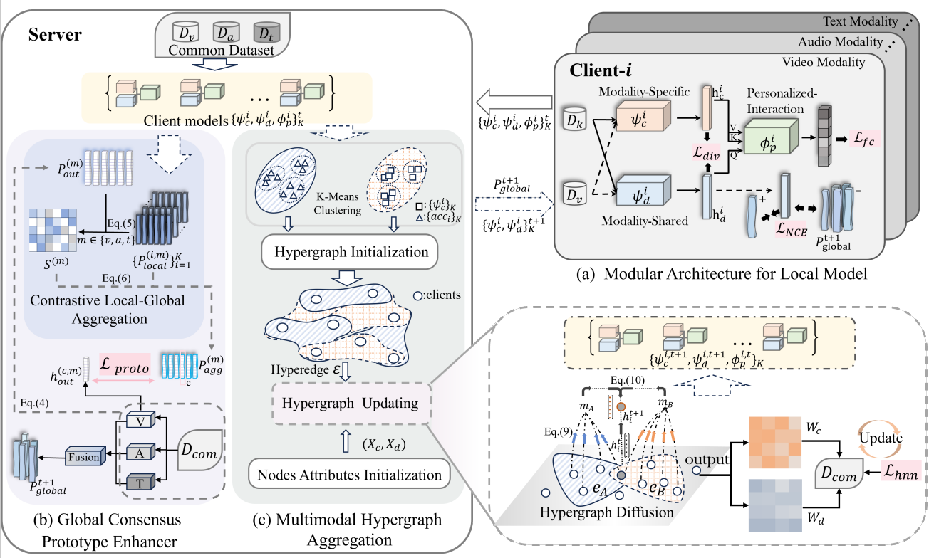该研究针对多模态联邦学习中常见的模态不兼容问题展开了深入研究,提出了一种创新的自适应超图聚合的多模态联邦学习框架。该框架通过结构化设计客户模型、全局共识原型增强器以及自适应超图聚合协作图三大关键模块,有效应对多模态联邦学习环境中的模态异质性和统计异质性挑战。即使在服务器无法获取客户端模态信息的情况下,该框架也能够自适应地完成多模态客户端聚合。