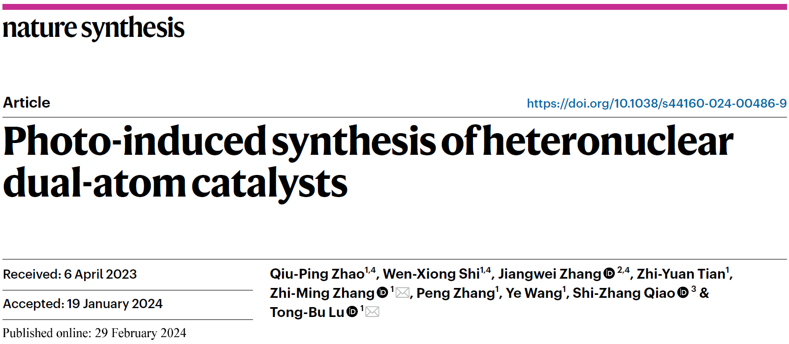 近日,我校新能源材料与低碳技术研究院张志明&鲁统部教授团队,在国际知名期刊Nature Synthesis上发表题为“Photo-induced synthesis of heteronuclear dual-atom catalysts”的论文。