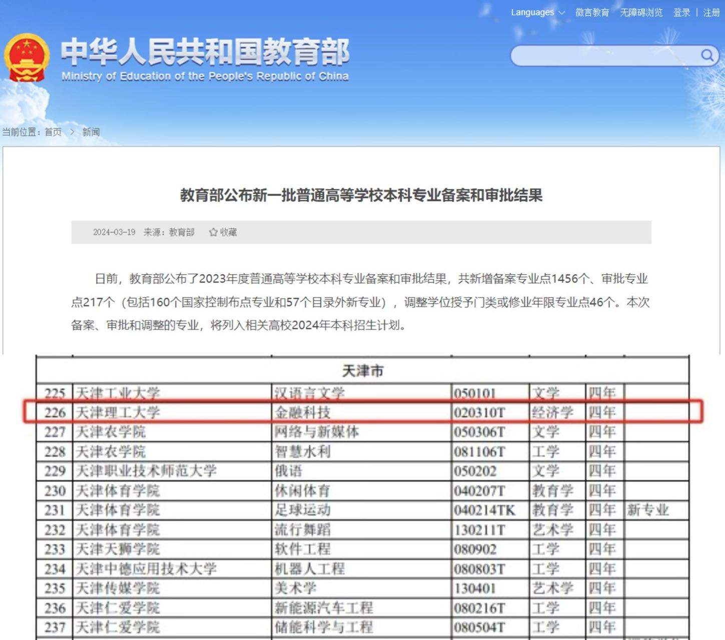 日前,教育部公布了2023年度普通高等学校本科专业备案和审批结果,我校管理学院申报的金融科技专业获教育部备案,准予设立,并纳入学校2024年招生计划。