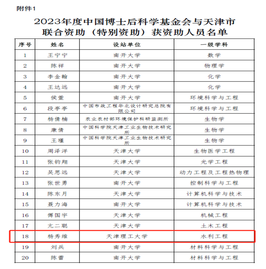 近日,中国博士后科学基金会发布了《关于公布2023年度中国博士后科学基金会与天津市联合资助(特别资助)获资助人员名单的通知》,我校计算机科学与技术博士后科研流动站杨秀维博士后成功入选。