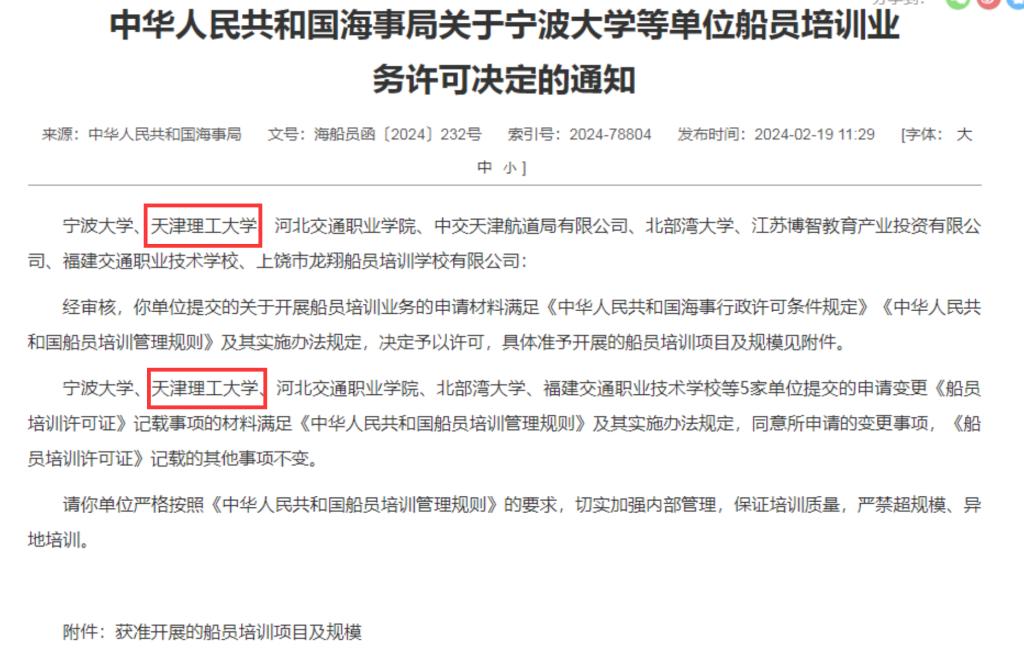 近日,交通运输部海事局发布《中华人民共和国海事局关于宁波大学等单位船员培训业务许可决定的通知》,经审核,我校船员培训业务许可规模扩大申请符合相关规定,决定予以许可,新的培训合格证有效期至2029年。