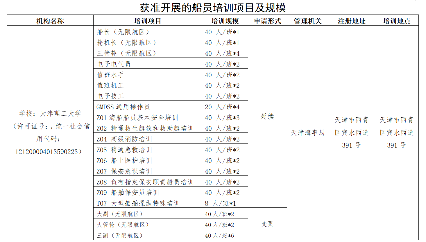 据悉,我校在2023年顺利通过交通运输部海事局组织的船员教育和培训质量管理体系换证审核和附件审核基础上,整合现有师资和设备资源,顺应船员培训社会需求,决定申请扩大船员培训业务许可规模。此次申报成功获批后,我校船员培训许可规模在保持原有20项培训项目不变的基础上,大副(无限航区)、大管轮(无限航区)培训规模均扩至40人/班*2,三副(无限航区)规模扩至40人/班*6。