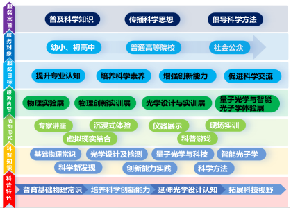 开云官方在线入口物理科普基地依托理学院物理实验中心(市级物理实验教学示范中心),建有力学、电学、光学实验室、演示实验室、专业物理实验室、光电实训平台以及物理虚拟仿真实验室。基地建设了“育、培、延、拓”四位一体展厅,面向大中小学、企事业单位、社区人员等,通过开展物理实验展示、物理创新实训、光学设计与实训、量子光学与智能光子学体验展等科普服务,营造场景式、体验式、沉浸式的科普氛围,帮助公众了解物理学的基础框架,培养对光学设计、量子科学等领域的认知,增加对物理学广度和深度的理解和认识,培养科学思维和批判性思维,激发公众的探索精神,助力全域科普向纵深发展。