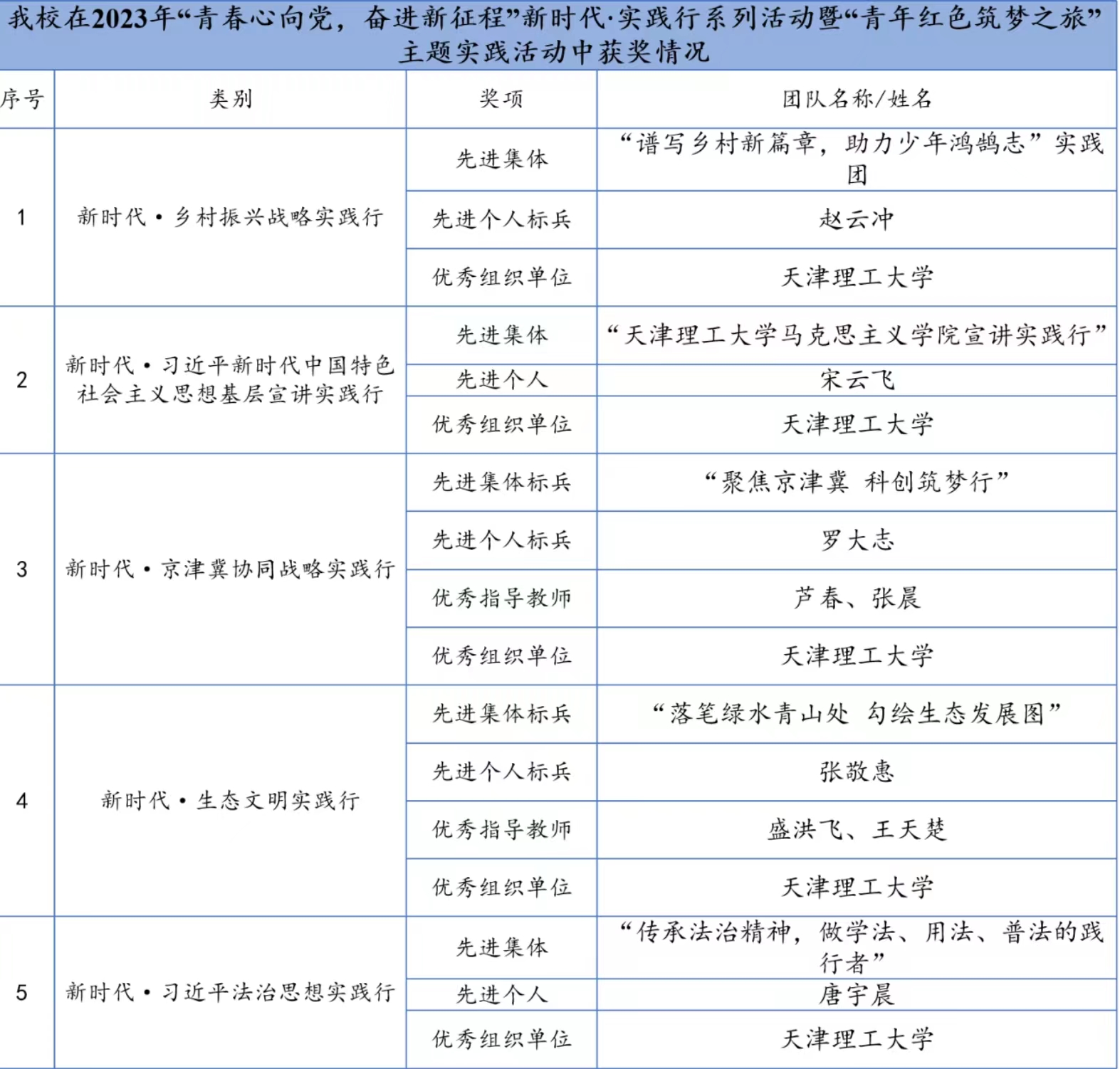 近日,市教育两委公布了2023年“青春心向党,奋进新征程”新时代·实践行系列活动暨“青年红色筑梦之旅”主题实践活动评审结果的通知,学校在此次活动评比中喜获佳绩,荣获先进集体标兵2项、先进集体3项、先进个人标兵3项、先进个人2项、优秀指导教师2项、优秀组织单位5项。