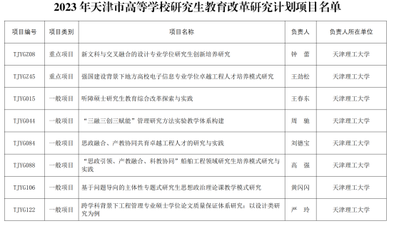 近日,市教委印发《关于公布2023年天津市高等学校研究生教育改革研究计划项目立项名单的通知》(津教研函〔2023〕12号),学校获批8项天津市高等学校研究生教育改革研究计划项目,其中重点项目2项,一般项目6项。
