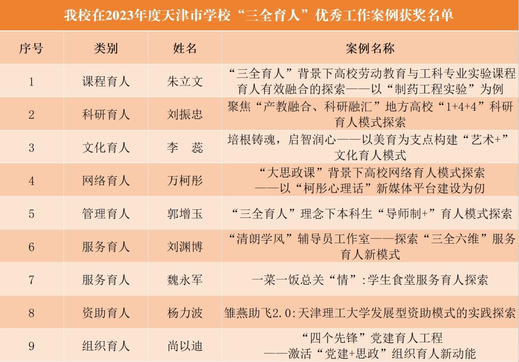 日前,市委教育工委、市教委印发《关于公布2023年度天津市学校“三全育人”优秀工作案例评选结果的通知》,我校共有9项工作案例入选高校组优秀工作案例。