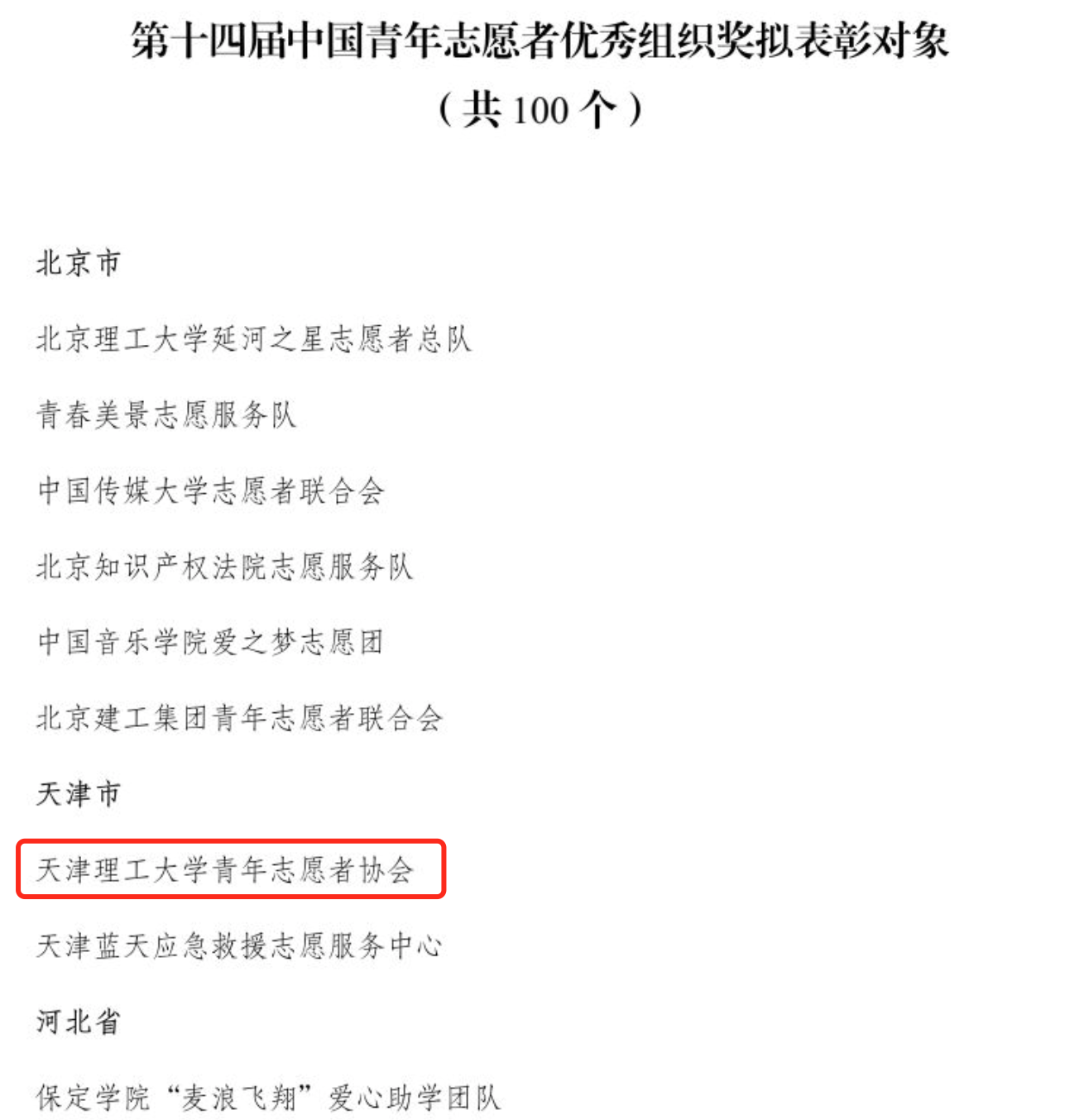 近日,共青团中央、中国青年志愿者协会表彰第十四届中国青年志愿者优秀个人奖260名、组织奖100个、项目奖100个。该奖项每两年组织一次,本届天津市共有两个志愿服务组织荣获青年志愿者优秀组织奖。我校青年志愿者协会荣获第十四届中国青年志愿者优秀组织奖。