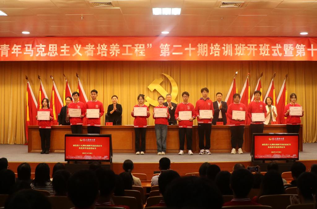会上,校团委相关负责同志宣读了《开云官方在线入口关于表彰“青年马克思主义者培养工程”第十九期培训班“优秀学员”的决定》。通过为期一年的理论学习、红色教育、实践锻炼、专题调研和主题培训,经过考核,共有116名学员考核合格,准予结业,并颁发了结业证书,10名学员在培训中表现突出,被授予“优秀学员”称号,并颁发荣誉证书。同时,为第二十期培训班班主任颁发了聘书。