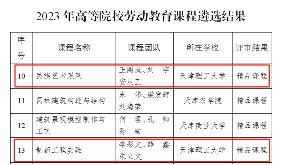 日前,天津市教委公布了2023年天津市高等院校劳动教育课程评选结果。我校艺术学院王阁岚、刘宇、安从工课程团队《民族艺术采风》,化学化工学院李彩文、薛鑫、朱立文课程团队《制药工程实验》被评为精品课程。