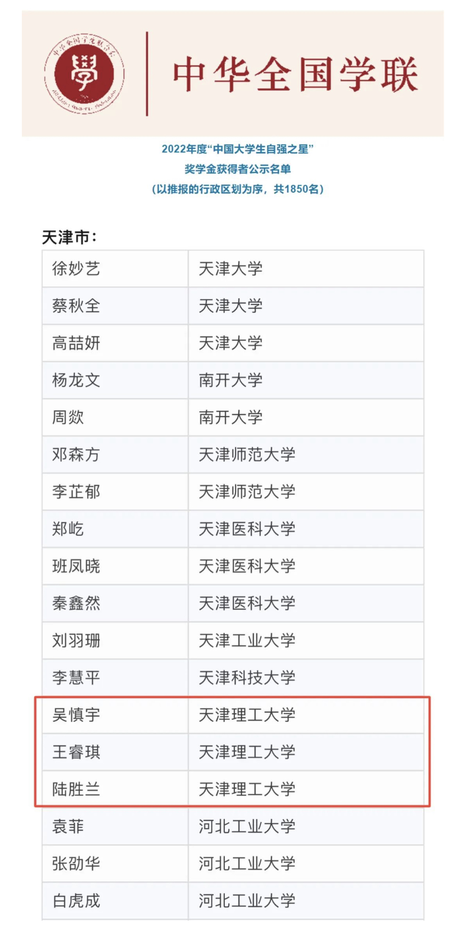 近日,由共青团中央、全国学联指导,中国青年报社、新东方教育科技集团、中国青年创业就业基金会联合举办的2022年度“中国大学生自强之星”奖学金推报活动结果揭晓,我校3名学子荣获2022年度“中国大学生自强之星”。此次全国范围内共表彰“中国大学生自强之星标兵”奖学金获得者10名,“中国大学生自强之星”奖学金获得者1850名。