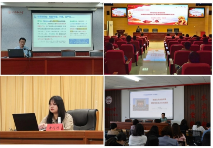 学院党委理论学习中心组坚持读原著、学原文、悟原理,同时创新学习形式,注重“学”与“行”相融合,不断提升学习实效。理论学习中心组成员走进联系支部,与支部党员一起开展学习;深入习近平新时代中国特色社会主义思想概论课堂,进行听课督导,与授课教师一起就课程建设进行研讨;列席校党委理论学习中心组交流研讨,进行导学。为深入推进主题教育宣传宣讲,学院成立由34名思政课教师组成的主题教育导学团,导学团成员已面向校内外开展了理论宣讲40余场。充分发挥新媒体优势,组织思政课教师录制“师生话盛会”系列访谈节目十期,持续宣传好党的创新理论。