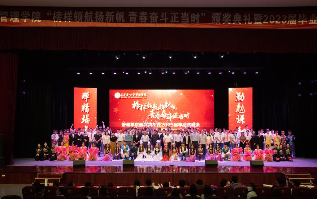 6月18日晚,管理学院“榜样领航扬新帆 青春奋斗正当时”颁奖典礼暨2023届毕业生晚会在大学生活动中心剧场举行。校党委副书记杜长有,党委常委、副校长张继东,天津市鼎基投资集团董事长孙汝为,天津福康健投资管理有限公司董事长欧阳玉岭,学工部、校团委、校友办负责人受邀出席晚会,学院党政领导、系主任、毕业班班主任和任课教师代表以及2023届毕业生和校友代表共计800余人参加活动。