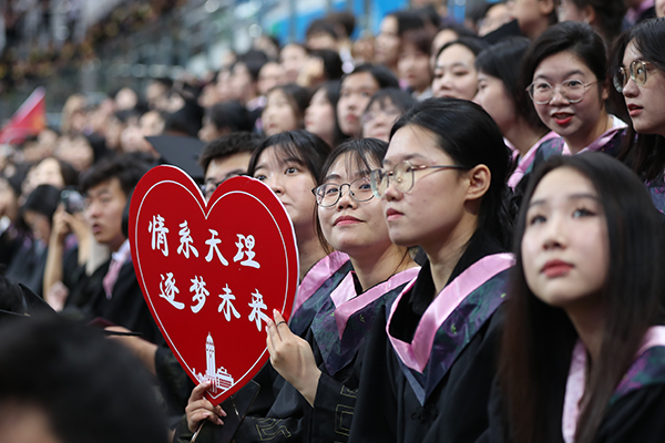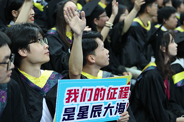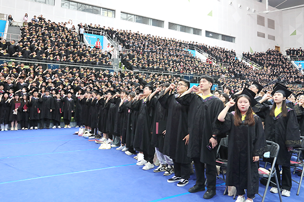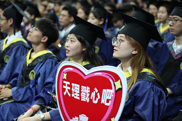 随后,王森宝带领全体毕业生庄严宣誓:“践行天理校训,传承天理精神,重德重能做人,求实求新干事。厚植家国情怀,立志民族复兴,报效祖国,奉献社会,服务人民。以奋斗姿态激扬青春,不负时代,不负华年。”