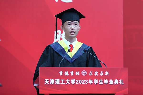 本科毕业生代表、集成电路科学与工程学院王森宝满怀深情地回顾了四年大学时光,感恩学校的培养,老师的教导和同学的陪伴,表示要以“天理之美”助力“人生之美”,做眼里有光、心中有梦、脚下有路的天理人,追求卓越、不负青春!