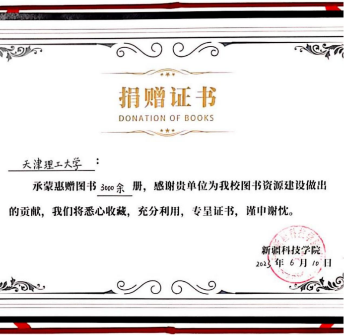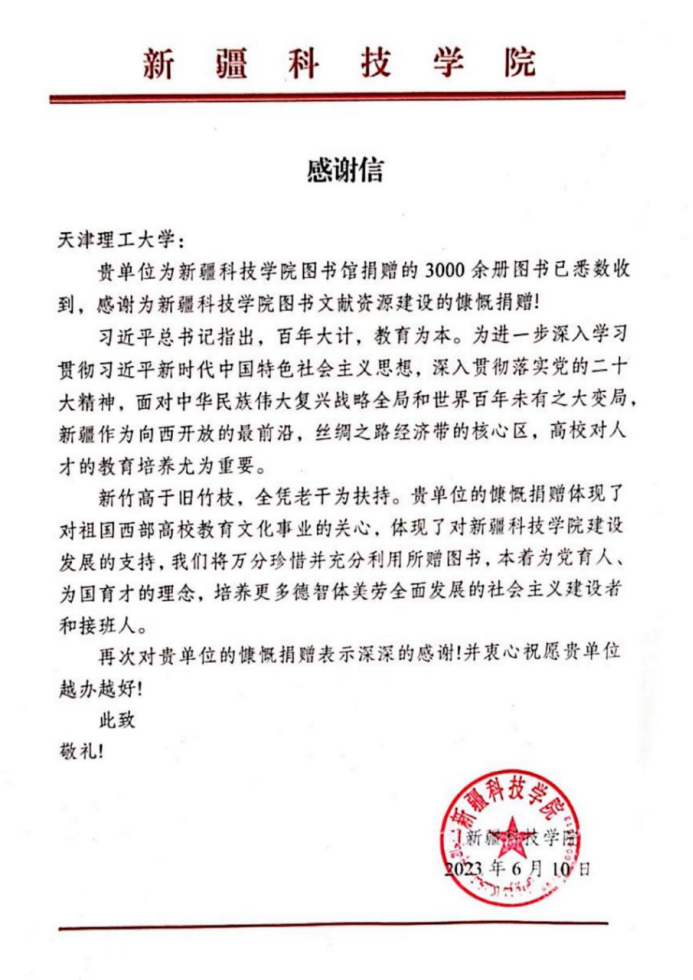 近日,学校收到新疆科技学院发来的图书捐赠证书和感谢信,感谢我校对新疆科技学院图书文献资源建设的慷慨捐助,对祖国西部高校教育文化事业的关心,对新疆科技学院建设发展的支持。信中还强调,将万分珍惜并充分利用所赠图书,坚持为党育人、为国育才,培养更多德智体美劳全面发展的社会主义建设者和接班人。