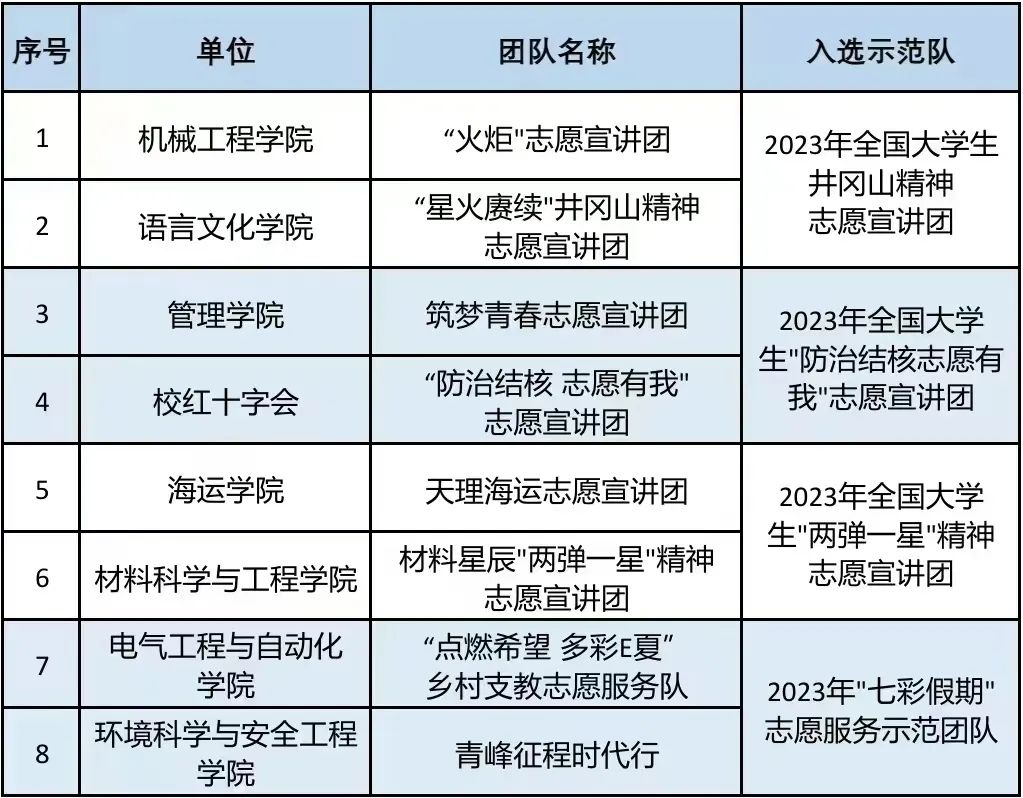 为落实“强国复兴有我”群众性主题宣传教育活动相关要求,共青团中央面向全国高校开展了井冈山精神、“两弹一星”精神、“防治结核 志愿有我”志愿宣讲团队、“七彩假期”志愿服务示范队遴选活动。近日,共青团中央公布入选团队名单,我校8支志愿服务队成功入选。