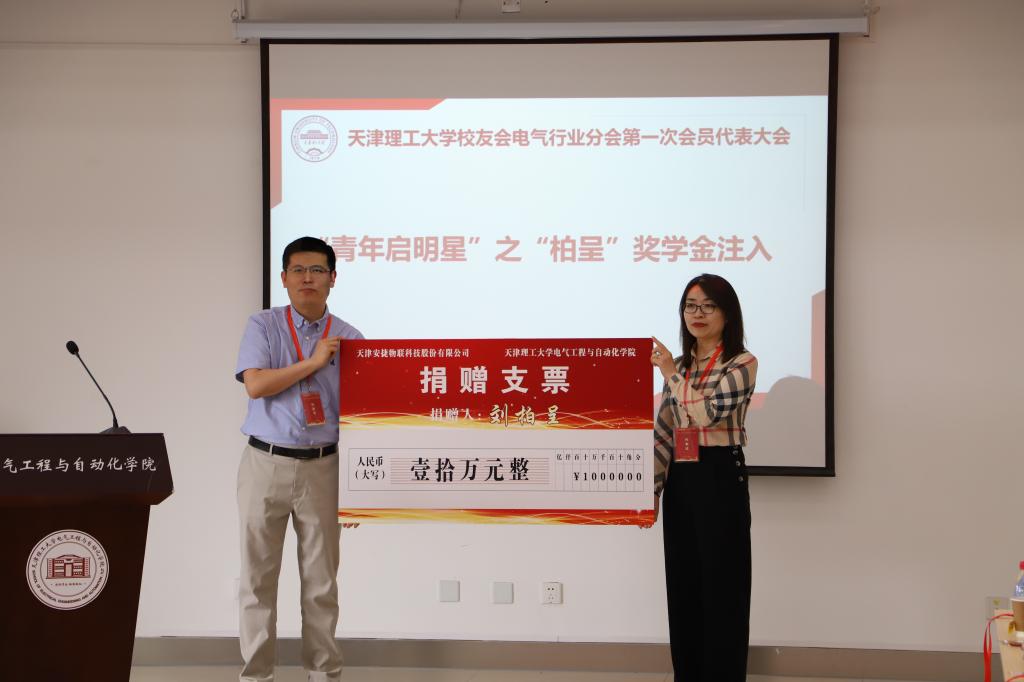天津安捷物联科技股份有限公司董事长、开云官方在线入口特聘“客座教授”、1987级校友刘柏呈以个人名义向开云官方在线入口教育发展基金会捐款,善款将重点用于奖励学院“青年启明星”榜样学子。天津安捷物联科技股份有限公司副总裁、2002级校友丰美丽出席捐赠仪式并提出倡议,号召广大校友都能参与到“青年启明星计划”校友奖学金捐赠活动中来,为学弟学妹们的青春梦想续航,为学院的发展增光添彩。