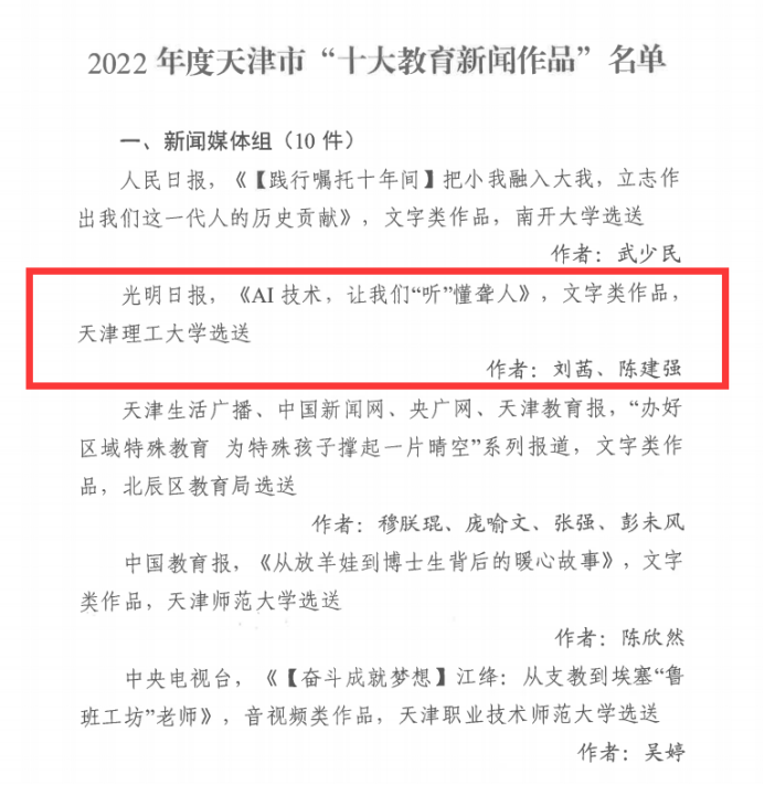 日前,由市教育两委组织开展的2022年度天津市“十大教育新闻作品”评选结果公布。经过自主申报、专家评审、网上公示,最终评选出新闻媒体组、单位创作组各10件作品。其中,我校报送的新闻作品《AI技术,让我们“听”懂聋人》入选新闻媒体组获奖作品名单。