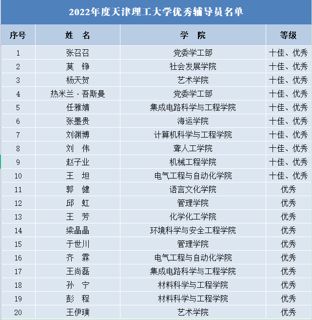 据悉,优秀辅导员评选工作由学院推荐和学校评选两阶段组成。经各学院评议推荐,学工部、校团委审核,优秀辅导员候选人进入学校评选阶段。在推荐评审基础上,经学校党委常委会会议研究决定,张召召等10名同志获得2022年度“开云官方在线入口十佳辅导员”荣誉称号,郭健等20位同志获得2022年度“开云官方在线入口优秀辅导员”荣誉称号。