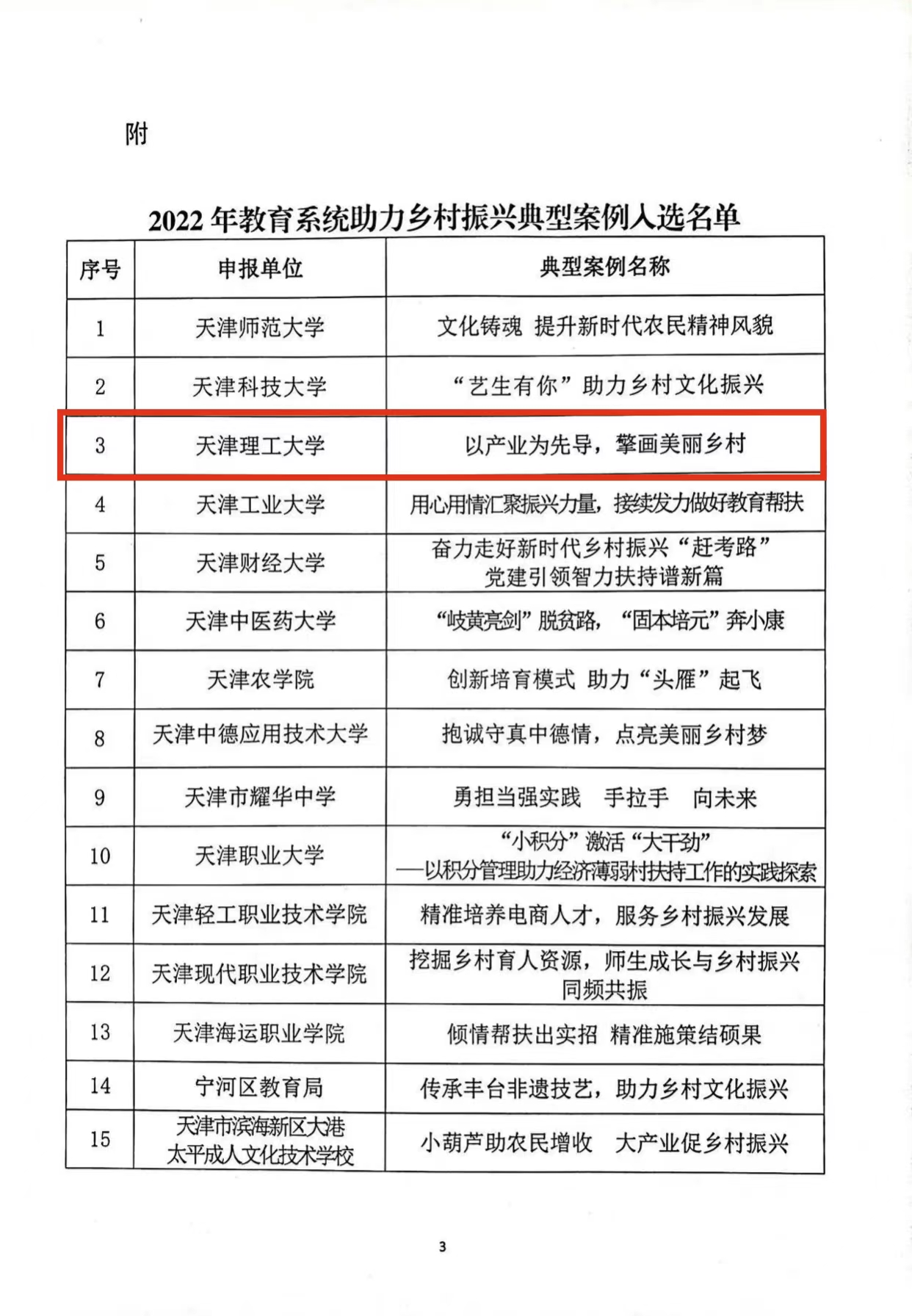 日前,天津市教育委员会公布2022年教育系统助力乡村振兴典型案例,我校派驻蓟州区下窝头镇扶持经济薄弱村驻村工作队申报的《以产业为先导,擎画美丽乡村》入选典型案例名单。