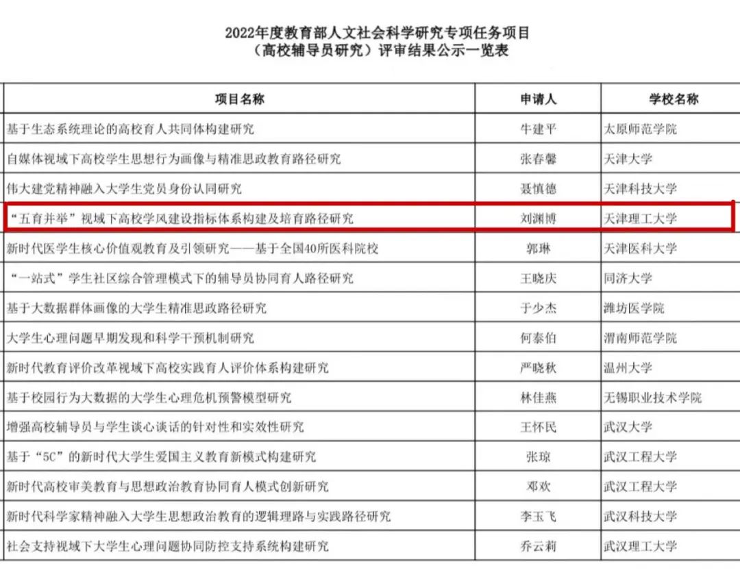 近日,教育部社科司发布了2022年度教育部人文社会科学研究专项任务项目(高校辅导员研究)评审结果。本次评审自年初开始启动申报工作,经专家评审,全国最终确定高校辅导员研究项目入选208项。我校计算机科学与工程学院辅导员刘渊博主持申报的《“五育并举”视域下高校学风建设指标体系构建及培育路径研究》获批立项。