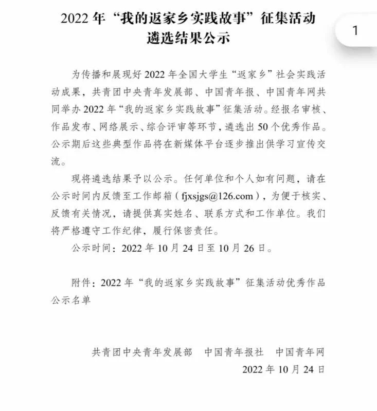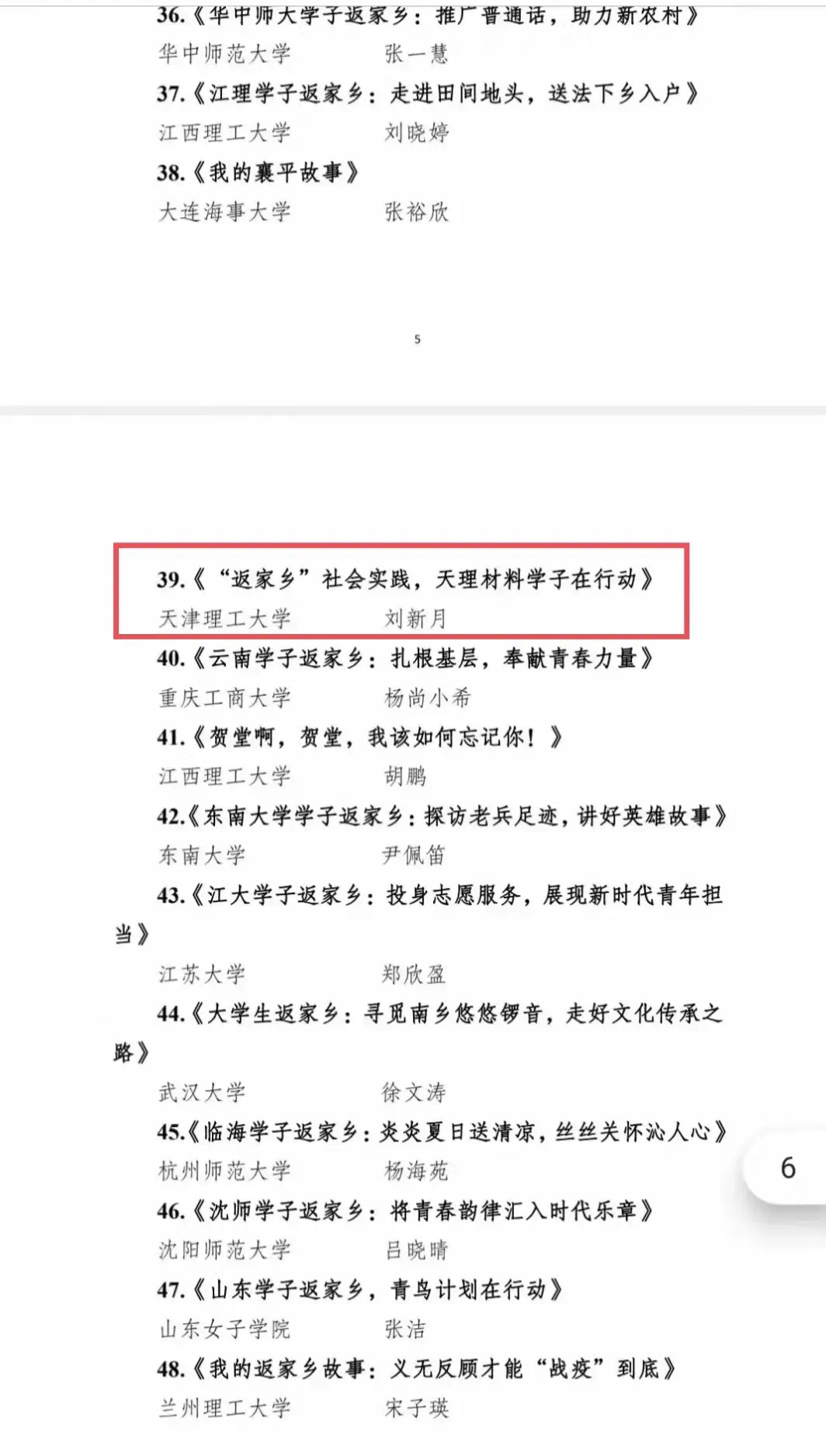 为传播和展现好2022年全国大学生“返家乡”社会实践活动成果,共青团中央青年发展部、中国青年报、中国青年网共同举办2022年“我的返家乡社会实践故事”征集活动。经报名审核、作品发布、网络展示、综合评审等环节,全国遴选出50个优秀作品。我校材料科学与工程学院2020级材料成型及控制工程专业刘新月撰写的《“返家乡”社会实践,天理材料学子在行动》成功入选。