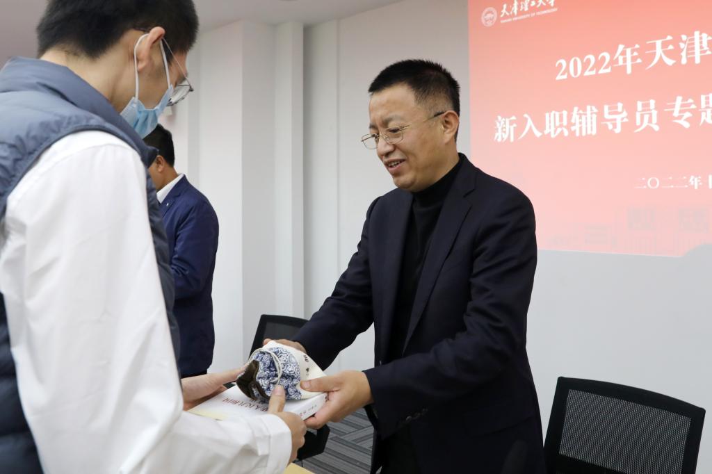 与会领导为新入职辅导员发放学习书籍与纪念品。
