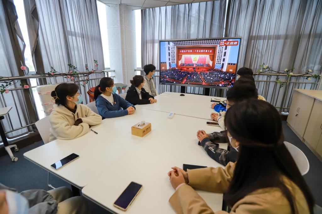 师生在明理家园“一站式”学生社区收看党的二十大开幕会