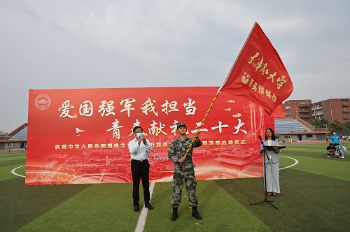 启动仪式上,校党委书记刘东志为“崇英”国防预储班授旗。