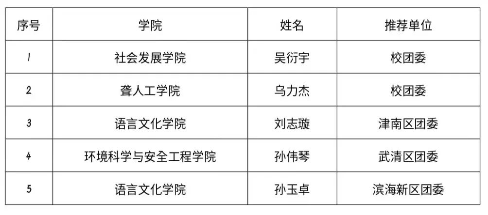 为进一步引领广大青年深入贯彻落实习近平总书记关于青年工作的重要思想,进一步用身边的榜样力量引领广大同学不断坚定理想、传承红色基因,鼓励新时代青年以青春之我践行“强国有我”青春宣言,团市委、市学联于近期开展了2021年度“中国大学生自强之星”奖学金推报工作,经院级推荐、校级评审、市级评选,我校社会发展学院吴衍宇,聋人工学院乌力杰,语言文化学院刘志璇、孙玉卓,环境科学与安全工程学院孙伟琴荣获2021年度天津市“大学生自强之星”荣誉称号。