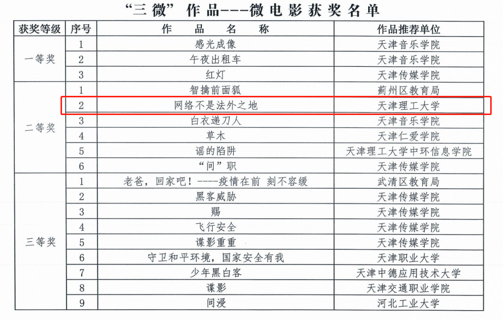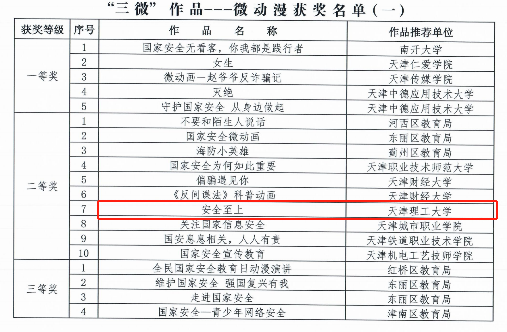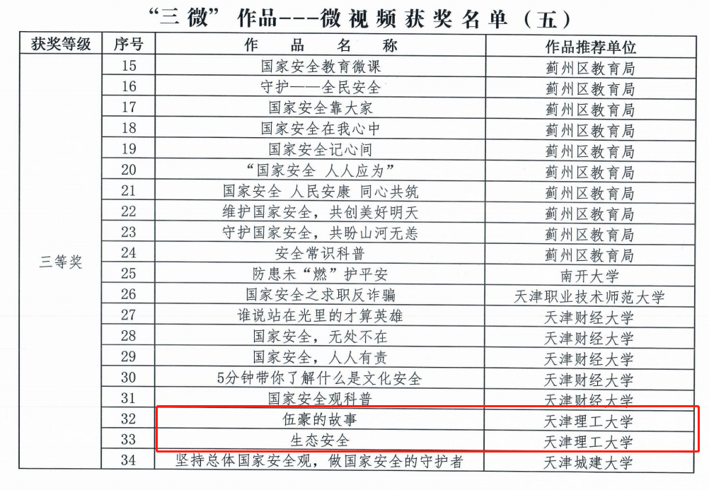 日前,市教育两委下发《关于2022年教育系统国家安全宣传教育活动“三微”作品获奖的通知》(津教安函〔2022〕23号)。各参评单位紧密围绕“树牢总体国家安全观,感悟新时代国家安全观成就,为迎接党的二十大胜利召开营造良好氛围”主题,以着力推动大安全理念深入人心、落地生根,筑牢坚如磐石的首都政治“护城河”、 确保全市政治社会大局持续安全稳定,以优异的成绩迎接党的二十大胜利召开为主线,共报送“三微”作品300余部,参与人数达800余人。经过报送单位初评、专家复评,共评选出微电影优秀作品18部、微视频优秀作品138部、微动漫优秀作品30部、优秀组织单位13家。我校师生创作的视频作品获得二等奖2个,获得三等奖2个。