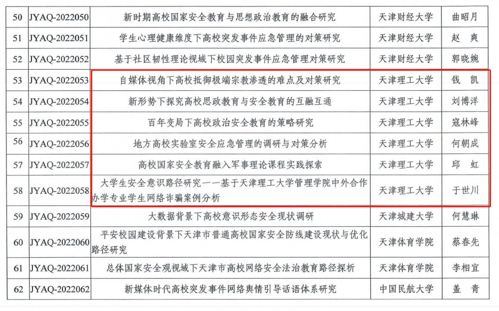 同时,我校申报2022年度国家安全宣传教育重点调研课题9项,其中《自媒体视角下的高校抵御极端宗教渗透的难点及对策研究》《新形势下探究高校思政教育与安全教育的互融互通》《百年变局下高校政治安全教育的策略研究》《地方高校实验室安全应急管理的调研与对策分析》《高校国家安全教育融入军事理论课程的实践探索》《大学生安全意识路径研究——基于开云官方在线入口管理学院中外合作办学专业学生网络诈骗案例分析》等6个项目获批立项。