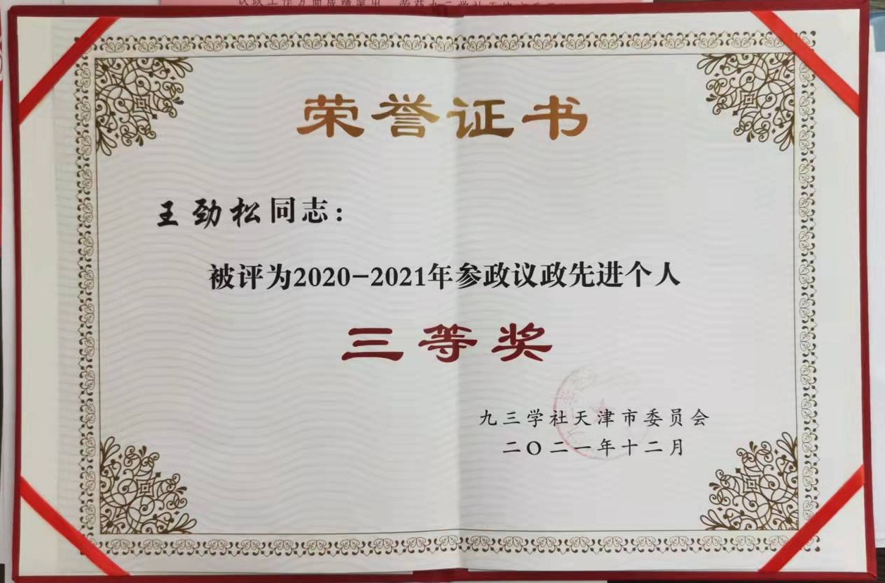 日前,九三学社市委会对2020-2021年期间在参政议政方面履职取得突出成绩、作出突出贡献的先进集体和先进个人予以表彰。我校九三学社社员安钢获“参政议政工作突出贡献奖”,王劲松获“2020-2021年度参政议政工作先进个人三等奖”。