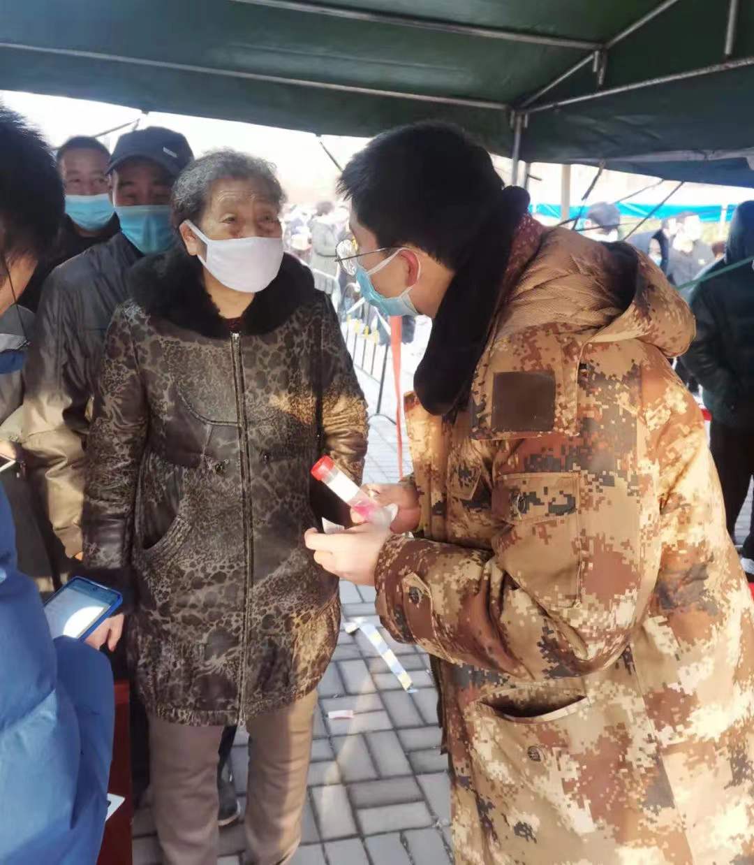 1月9日凌晨三点,王九龙主动加入到战“疫”第一线。协助军粮城辖区点位组织全员核酸检测大筛工作。在一线现场,他负责群众电子和手动信息检录、群众身份核对、检测场地搭建、维护检测秩序、补充物资等工作。从深夜的无数灯火通明,到一天近20个小时的“排兵布阵”,一切努力皆为保障人民群众生命安全和身体健康,为天津全员核酸检测出一份自己的力量。从日出时分搭建场地开始行动,到日落时分全员有序组织筛查,王九龙身穿青马服,再套军大衣,每日两万多步的青春坚守,彰显了天理青年的责任与担当。